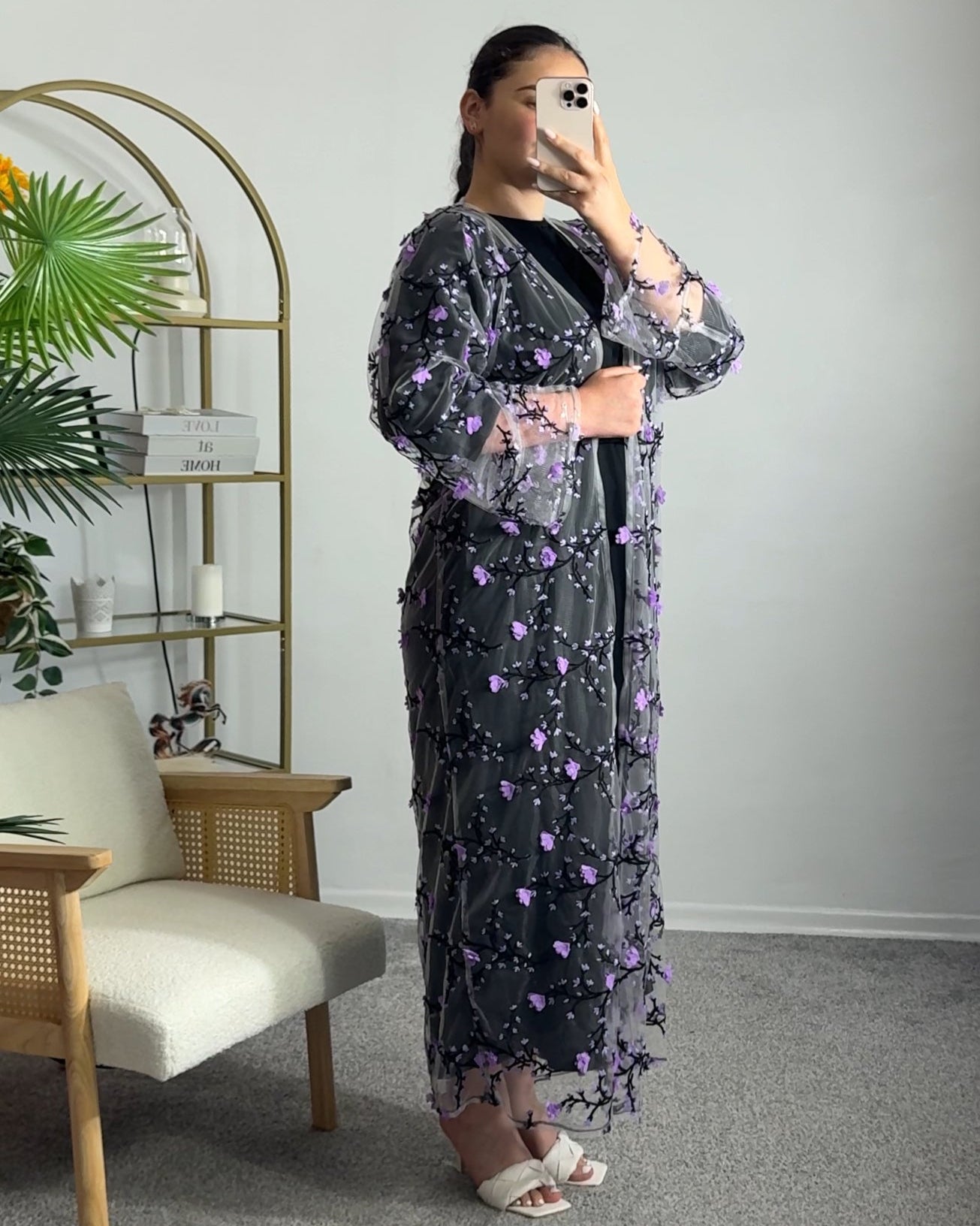 Shop NowA graceful lilac abaya with 3D florals and gold thread—elegant, feminine, and perfect for special occasions. Slip included.