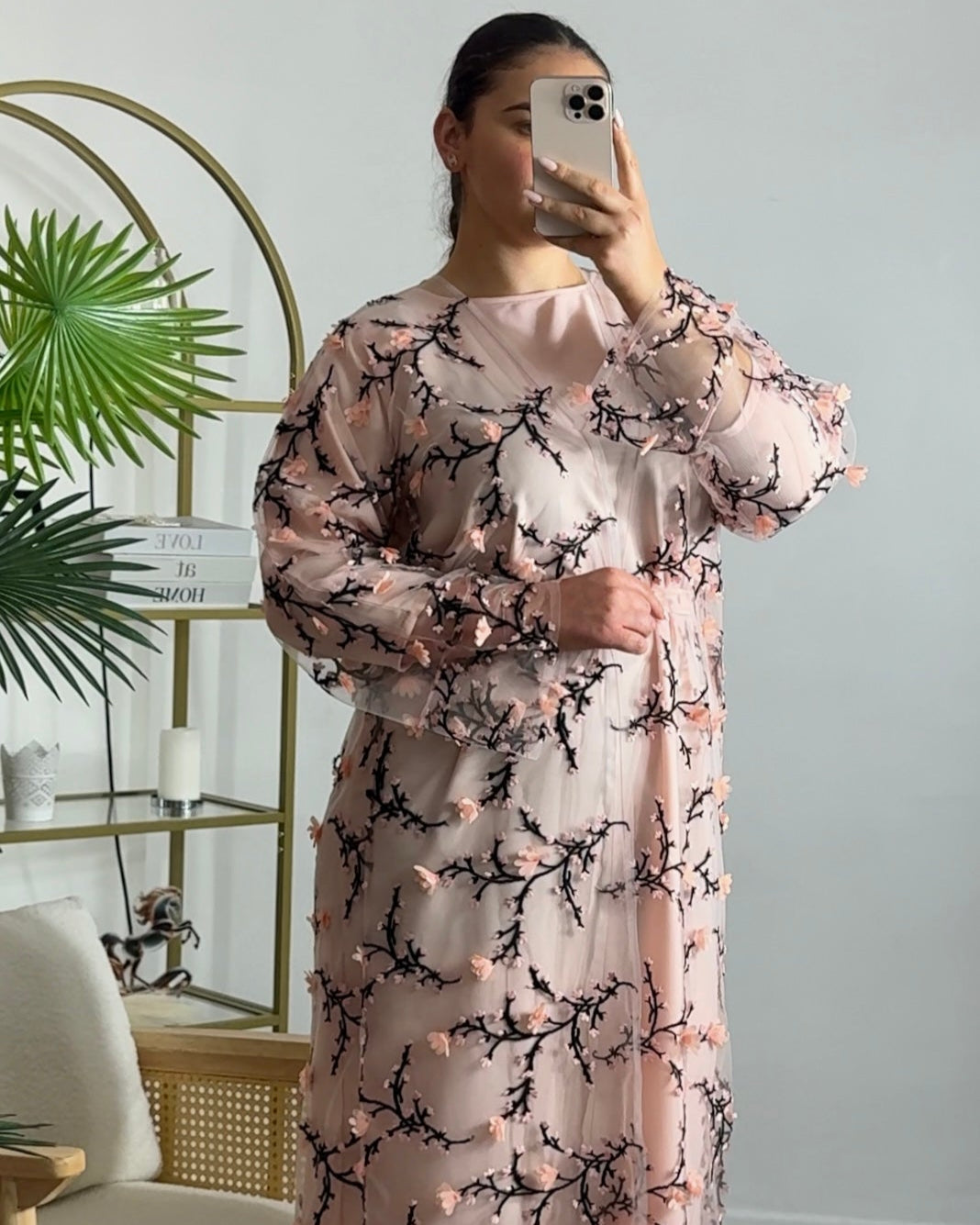 Step into timeless elegance of our Blush Blossom Abaya Set. Crafted from a soft blush-toned base, this set features a sheer outer abaya adorned with intricate black branch embroidery and soft 3D pink floral appliqué. The set includes a matching blush inner slip dress for a seamless, modest look.