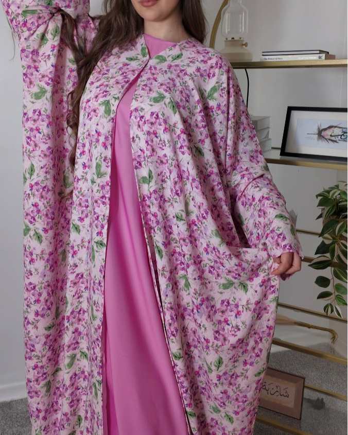 Step into radiant elegance with our Blossom Pink Abaya. This ensemble features a charming floral Abaya in shades of soft pink and purple, delicately scattered across a creamy white backdrop with fresh green leaves. Underneath, a smooth Neda material slip dress in vibrant pink offers comfort, breathability, and a luxurious feel against the skin.