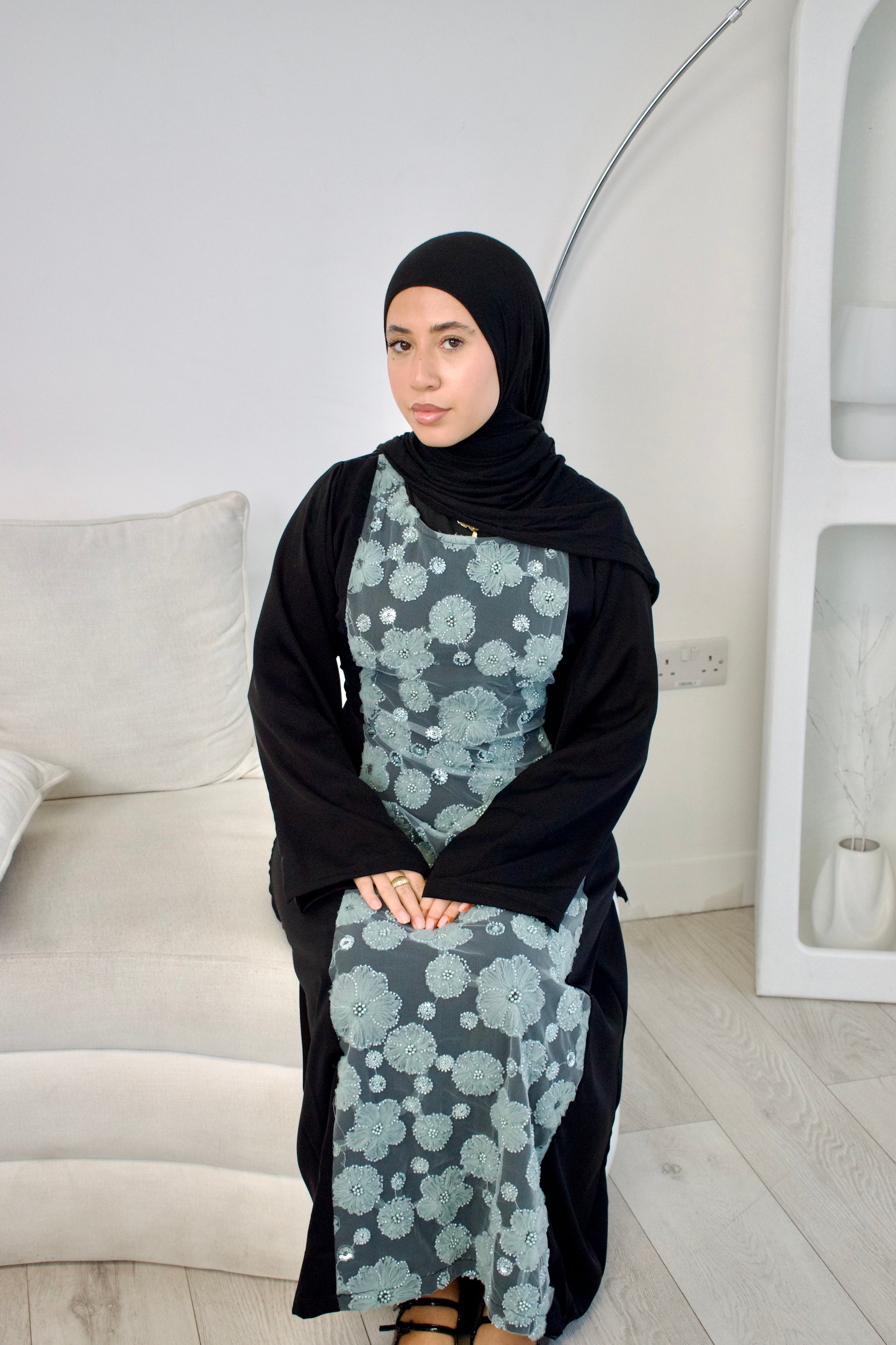 Graceful and refined, our Black & Teal Embellished Floral Dress is crafted from premium Neda material, offering a silky-soft feel, fluid drape, and breathable comfort. Designed for modest sophistication, this dress features elegant floral embroidery with delicate beadwork across the front panel, finished with a back tie detail that allows you to adjust the fit while keeping the flowing silhouette.