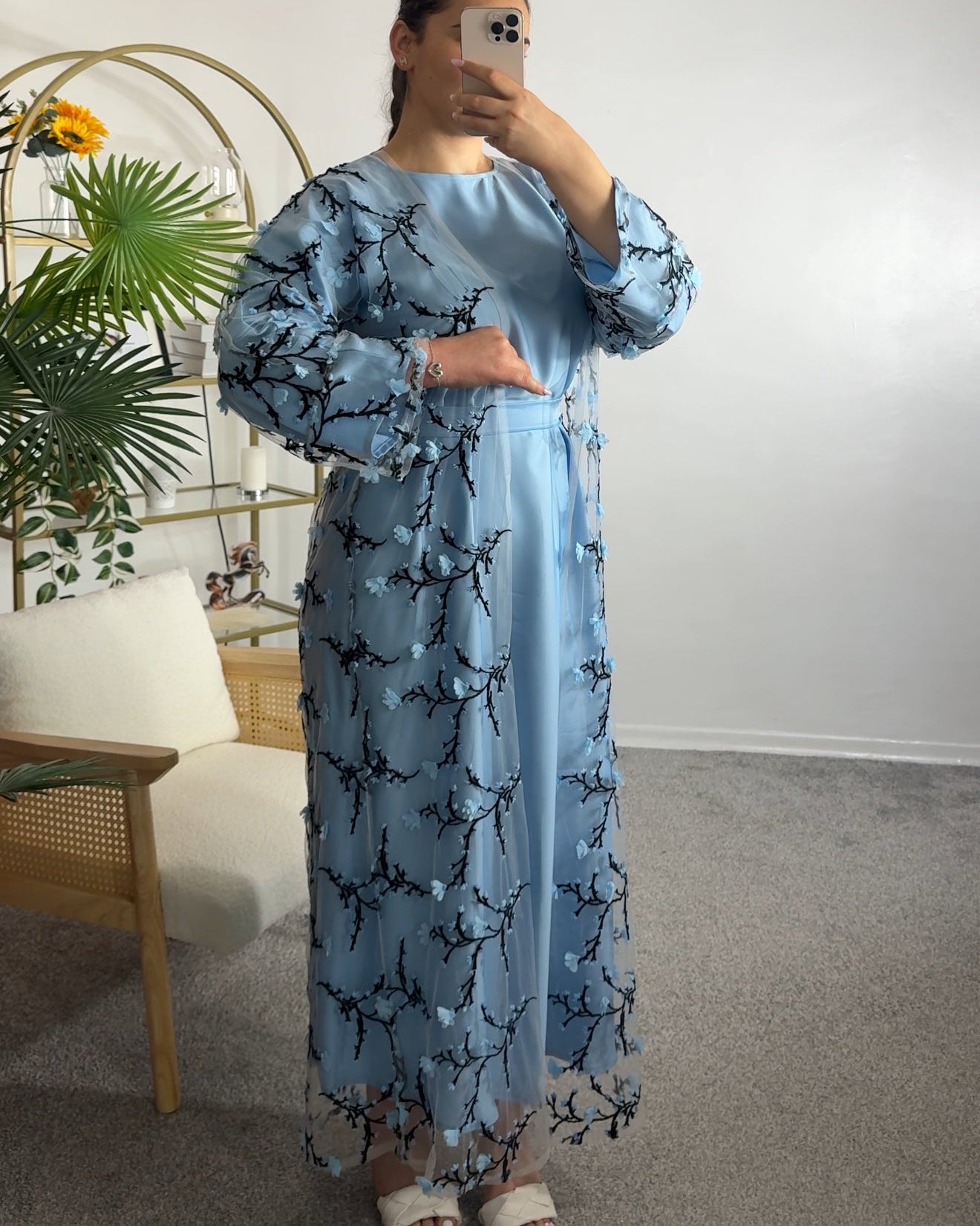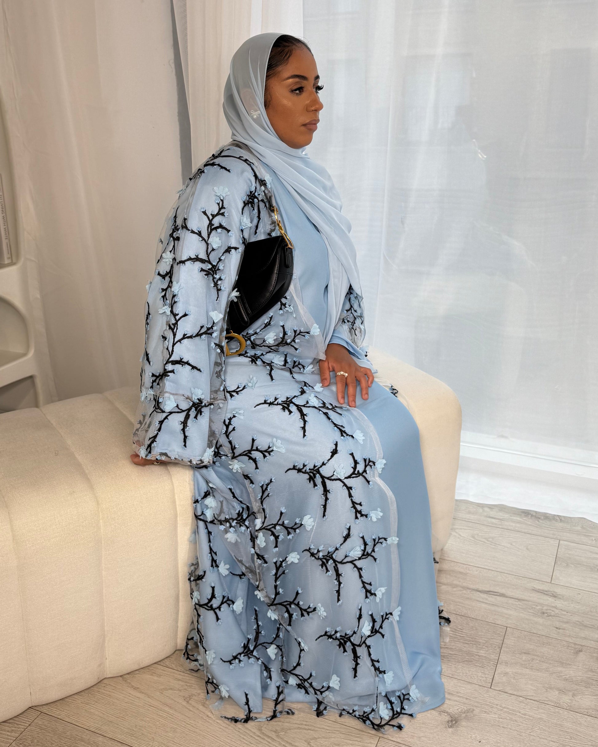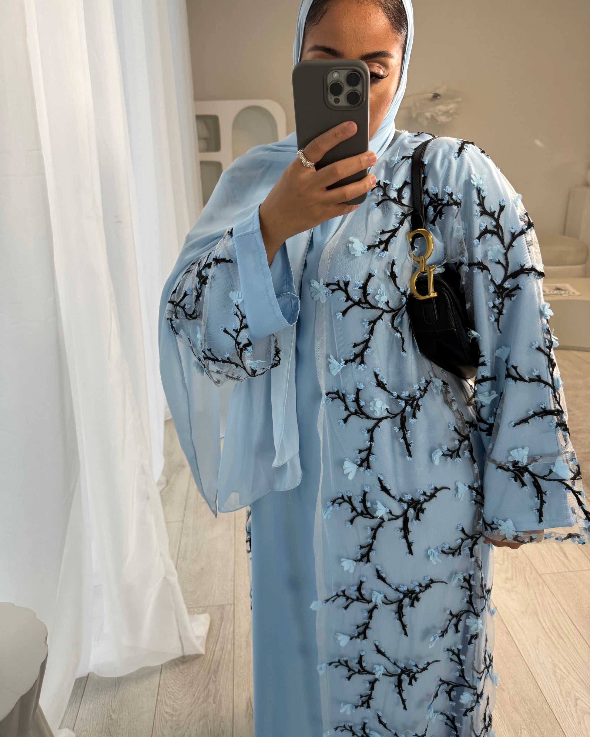Refresh your wardrobe with the serene beauty of the Sky Bloom Abaya Set. This dreamy ensemble features a soft sky blue inner slip dress layered with a sheer outer abaya embroidered with striking black branches and delicate 3D baby blue floral appliqué. Lightweight, elegant, and modest this set is a perfect choice for Eid, formal gatherings, or any special occasion.