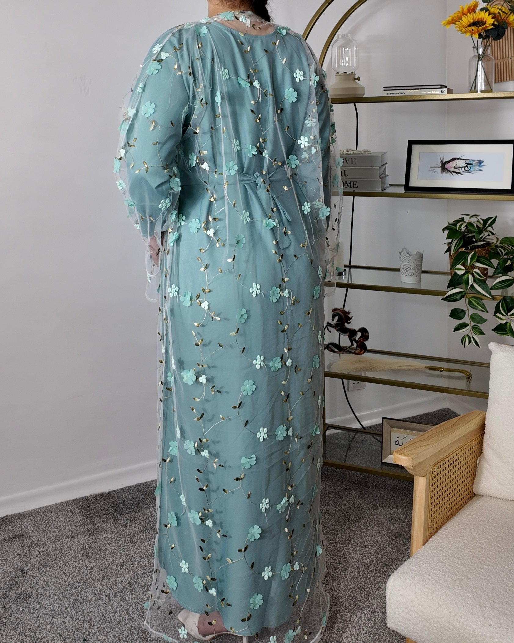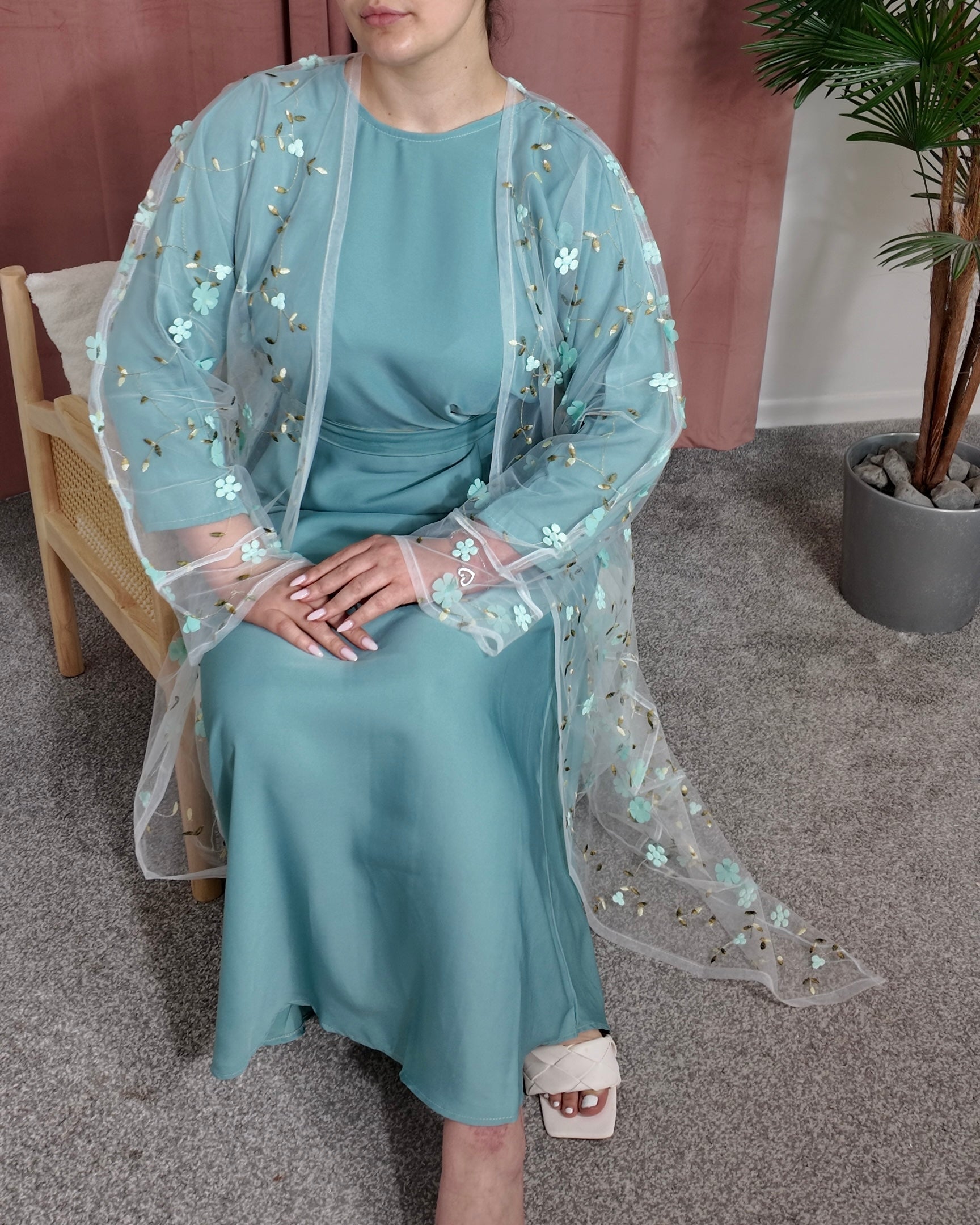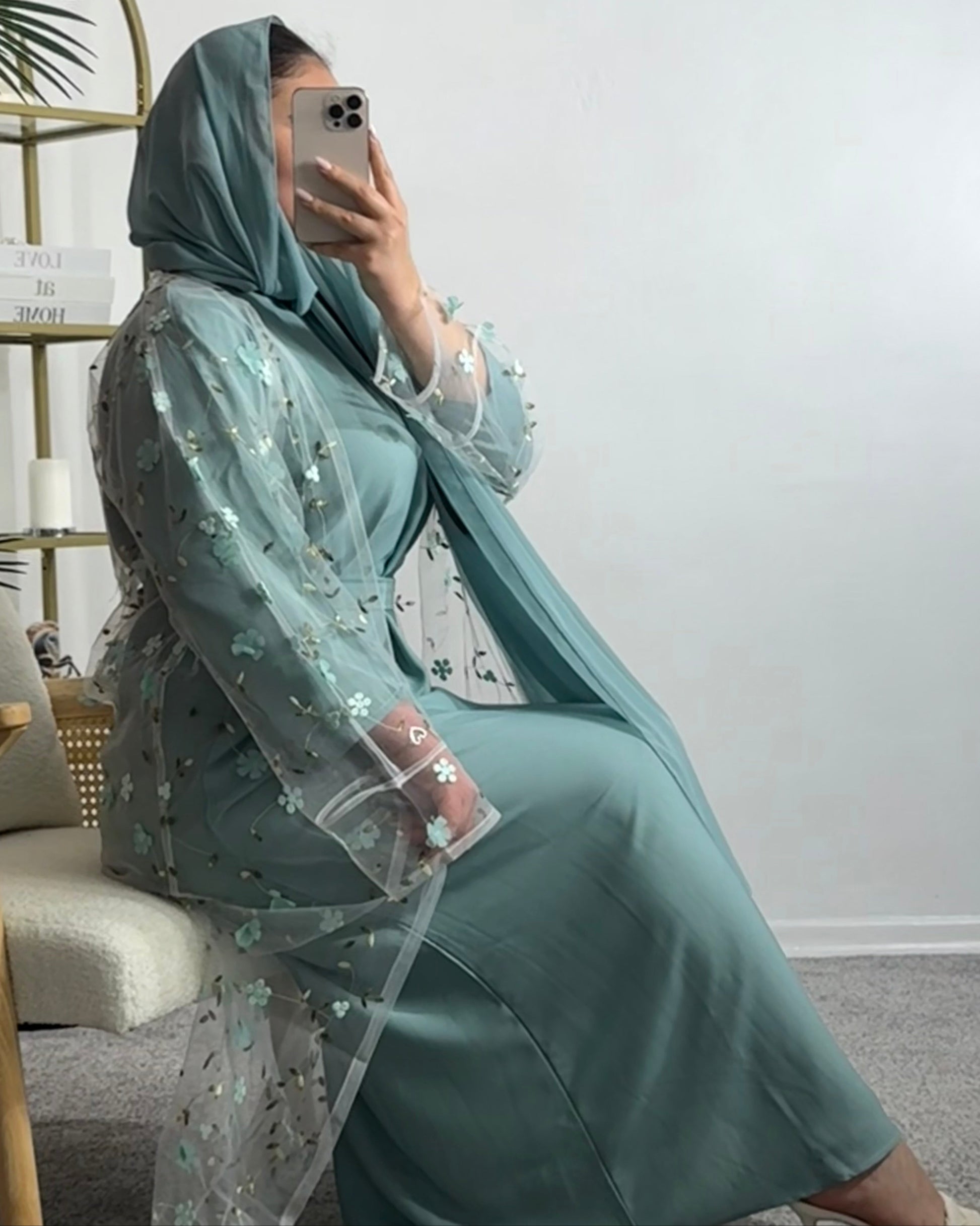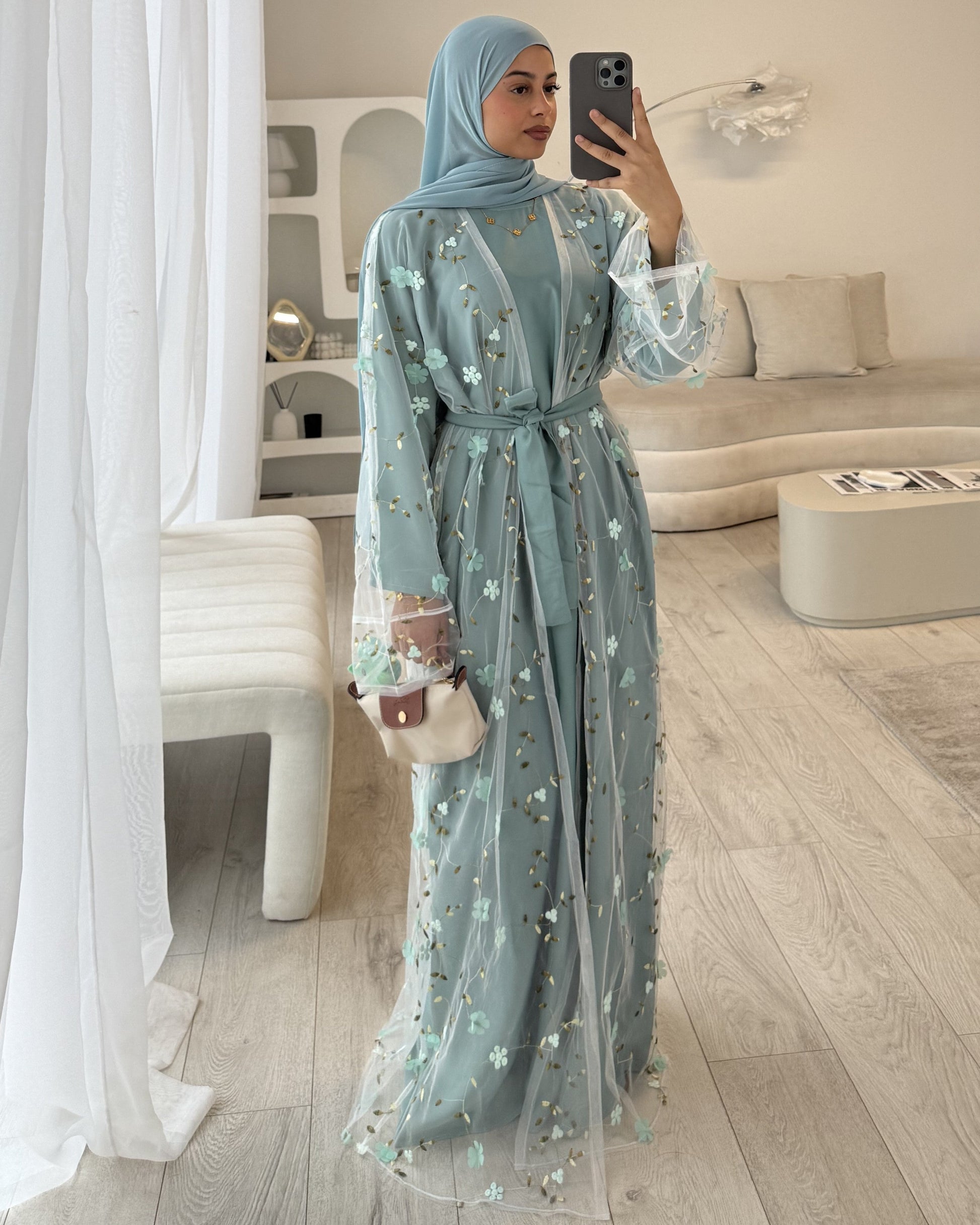 A graceful and elegant abaya set perfect for special occasions. Featuring a sheer lilac outer layer with 3D floral embroidery and delicate gold thread detailing, this abaya brings a soft, feminine touch to your wardrobe. Comes with a matching inner slip dress for full coverage and comfort.